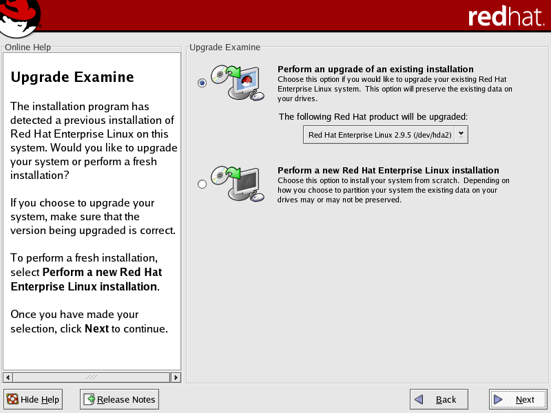 The Upgrade Examine screen appears if you have instructed the installation program to perform an upgrade by typing the linux upgrade command at the boot prompt.