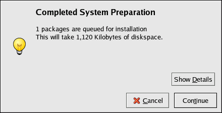 After selecting package groups and individual packages to install, click the Update button on the main window. The number of packages to be installed and the amount of disk space required to install the packages as well as any package dependencies is displayed in a summary window. If there are package dependencies, they will be automatically added to the list of packages to install. Click the Show Details button to view the complete list of packages to be installed.