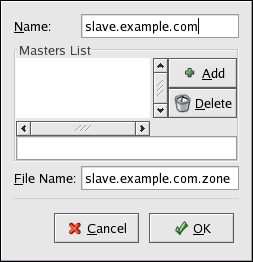 To add a slave zone (also known as a secondary master), click the New button and select Slave Zone. Enter the domain name for the slave zone in the Domain name text area.