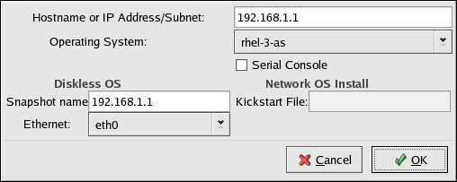 Hostname or IP Address/Subnet — Specify the hostname or IP address of a system to add it as a host for the diskless environment. Enter a subnet to specify a group of systems.