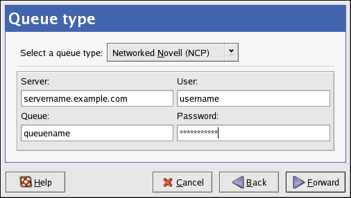 Select Networked Novell (NCP) from the Select a queue type menu.
