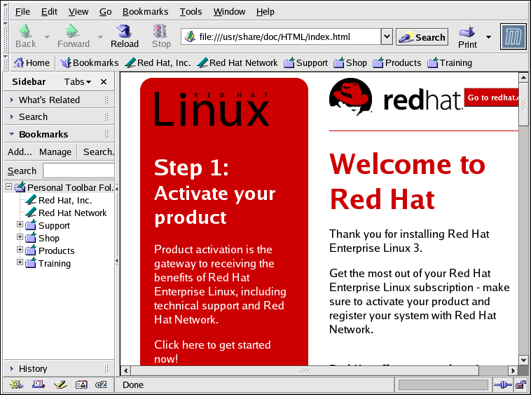 Once you have configured your Internet connection, you are ready to get online. Red Hat Enterprise Linux comes with several Web browsers, graphical applications that use your Internet connection to access the World Wide Web: news, research, shopping, banking, and more. This chapter briefly explains how to surf the Web using Mozilla. For information about using the Konqueror Web browser, refer to Section A.6 Browsing the Web with Konqueror.