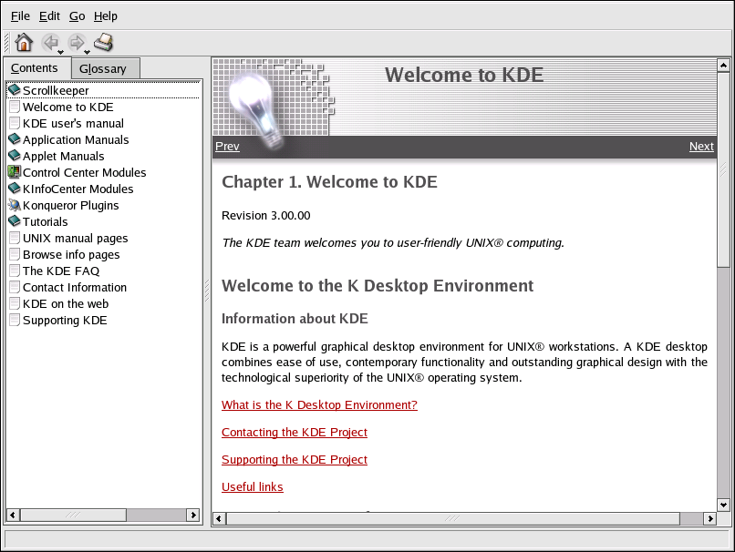 The opening screen of the HelpCenter browser appears like Figure A-1. From this main page, you can view help documentation on topics such as using and configuring the desktop, working with the many applications included with KDE, and working with the Konquerer file manager.