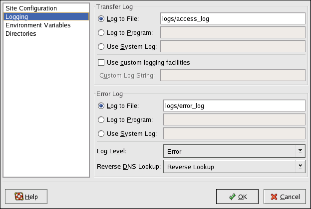 The transfer log contains a list of all attempts to access the Web server. It records the IP address of the client that is attempting to connect, the date and time of the attempt, and the file on the Web server that it is trying to retrieve. Enter the name of the path and file in which to store this information. If the path and filename does not start with a slash (/), the path is relative to the server root directory as configured. This option corresponds to the TransferLog directive.