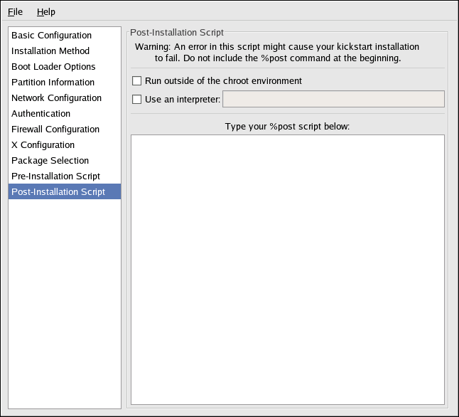 To specify a scripting language to use to execute the script, select the Use an interpreter option and enter the interpreter in the text box beside it. For example, /usr/bin/python2.2 can be specified for a Python script. This option corresponds to using %post --interpreter /usr/bin/python2.2 in your kickstart file.