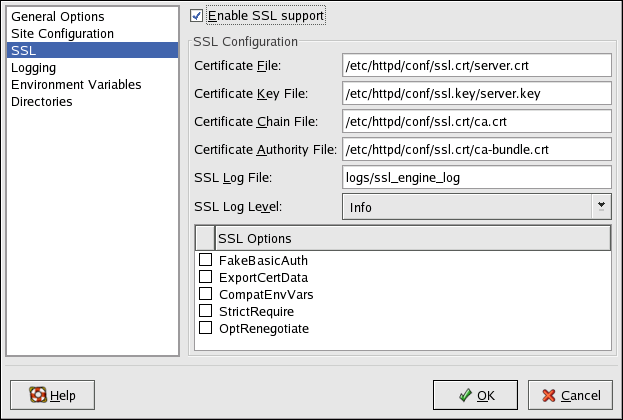 If an Apache HTTP Server is not configured with SSL support, communications between an Apache HTTP Server and its clients are not encrypted. This is appropriate for websites without personal or confidential information. For example, an open source website that distributes open source software and documentation has no need for secure communications. However, an ecommerce website that requires credit card information should use the Apache SSL support to encrypt its communications. Enabling Apache SSL support enables the use of the mod_ssl security module. To enable it through HTTP Configuration Tool you must allow access through port 443 under the Main tab => Available Addresses. Refer to Section 26.1 Basic Settings for details. Then, select the virtual host name in the Virtual Hosts tab, click the Edit button, choose SSL from the left-hand menu, and check the Enable SSL Support option as shown in Figure 26-9. The SSL Configuration section is pre-configured with the dummy digital certificate. The digital certificate provides authentication for your secure Web server and identifies the secure server to client Web browsers. You must purchase your own digital certificate. Do not use the dummy one provided for your website. For details on purchasing a CA-approved digital certificate, refer to the Chapter 27 Apache HTTP Secure Server Configuration.