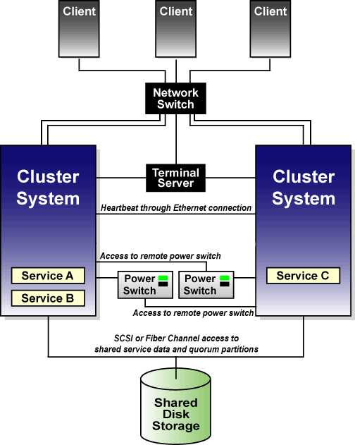 You can set up an active-active configuration in which the members run different services, or a hot-standby configuration in which a primary member runs all the services, and a backup cluster system takes over only if the primary system fails.