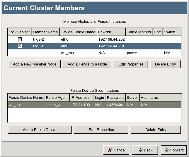 The added node appears within the Member Nodes and Fence Instances section. You can configure any member node by clicking the Edit Properties button. Clicking Delete Entry deletes the highlighted member node.