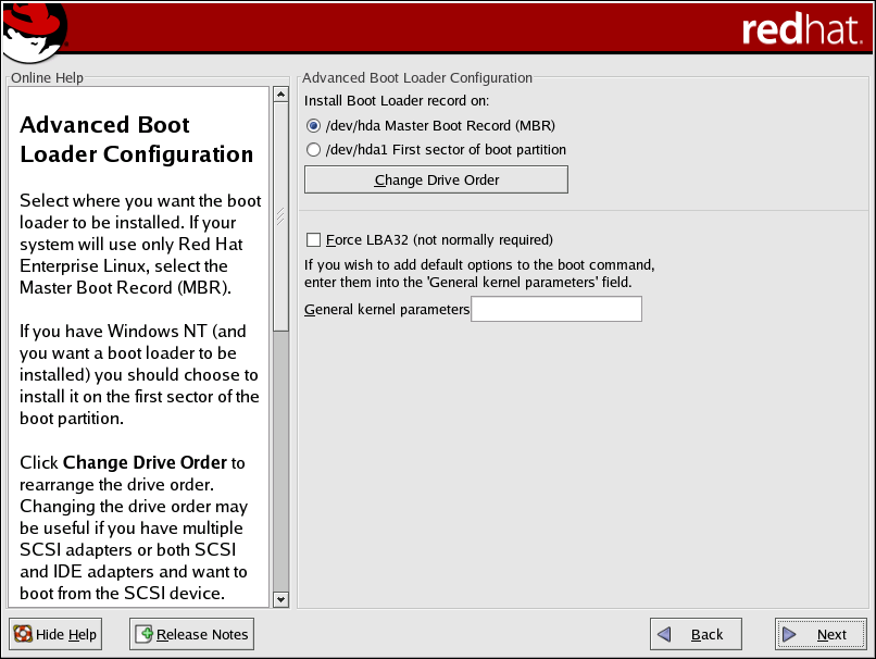 The Force LBA32 (not normally required) option allows you to exceed the 1024 cylinder limit for the /boot partition. If you have a system which supports the LBA32 extension for booting operating systems above the 1024 cylinder limit, and you want to place your /boot partition above cylinder 1024, you should select this option.