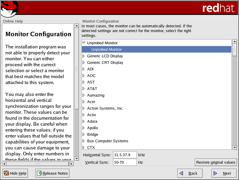 If your monitor does not appear on the list, select the most appropriate Generic CRT or Generic LCD model available. If you select a Generic CRT or Generic LCD monitor, the installation program suggests horizontal and vertical sync ranges. These values are generally available in the documentation which accompanies your monitor, or from your monitor's vendor or manufacturer; please check your documentation to make sure these values are set correctly.