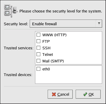 The options selected are also written to the /etc/sysconfig/redhat-config-securitylevel file so that the settings can be restored the next time the application is started. Do not edit this file by hand.