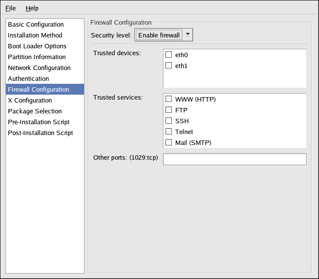 If Disable firewall is selected, the system allows complete access to any active services and ports. No connections to the system are refused or denied.