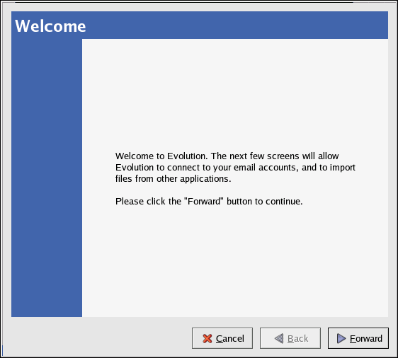 The first time you start Evolution you are presented with the Welcome Screen (Figure 6-1), which allows you to configure your email connection. Follow the on-screen instructions and fill in the information you collected from your ISP or administrator in the text boxes provided. When you are done, click Finish, to be presented with the Main Screen as shown in Figure 6-2.