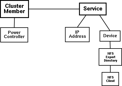 Each member can have power controller children. Each service can have IP address children. Each Service can also have device children. Each device can have NFS export directory children. Each NFS export directory can have client children. This structure is reflected in the /etc/cluster.xml file syntax.