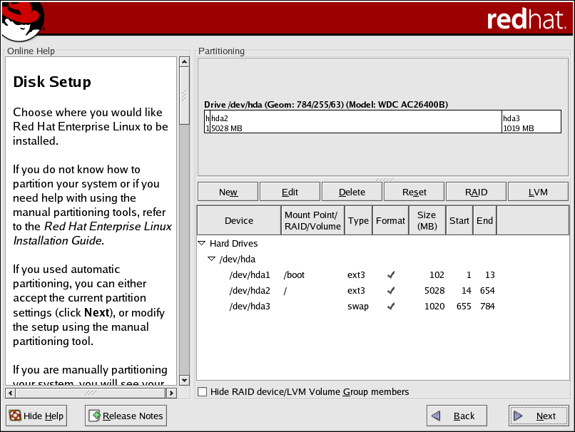 If you chose automatic partitioning and selected Review, you can either accept the current partition settings (click Next), or modify the setup using Disk Druid, the manual partitioning tool.