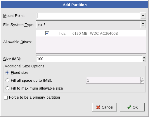 Force to be a primary partition: Select whether the partition you are creating should be one of the first four partitions on the hard drive. If unselected, the partition is created as a logical partition. Refer to Section D.1.3 Partitions within Partitions — An Overview of Extended Partitions, for more information.