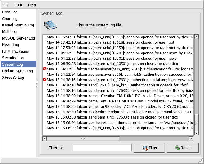 To view system log files in an interactive, real-time application, use the Log Viewer. To start the application, go to the Main Menu Button (on the Panel) => System Tools => System Logs, or type the command redhat-logviewer at a shell prompt.