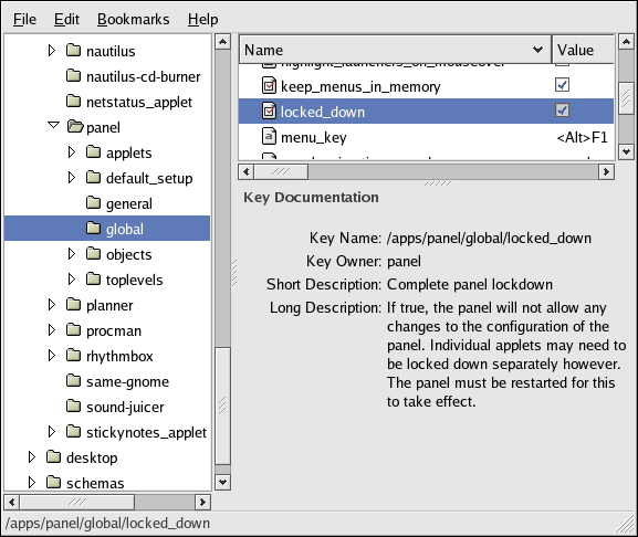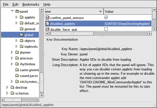 For example, to disable the Show Desktop applet, add the applet IID OAFIID:GNOME_ShowDesktopApplet to the /apps/panel/global/disabled_applets key as shown in Figure 4-5.