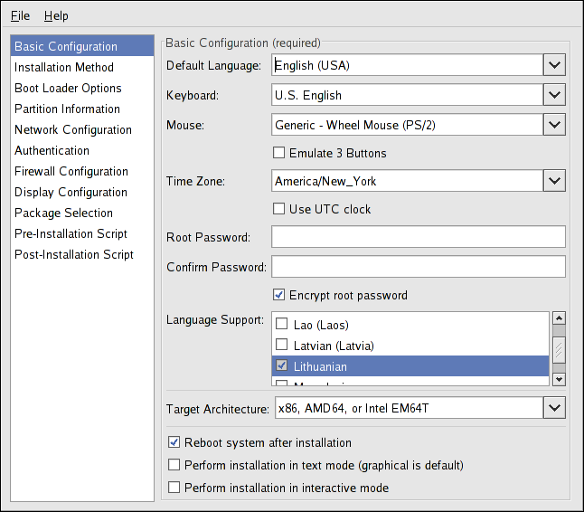 To install languages in addition to the one selected from the Default Language pulldown menu. check them in the Language Support list. The language selected from the Default Language pulldown menu is used by default after installation; however, the default can be changed with the Language Configuration Tool (system-config-language) after installation.