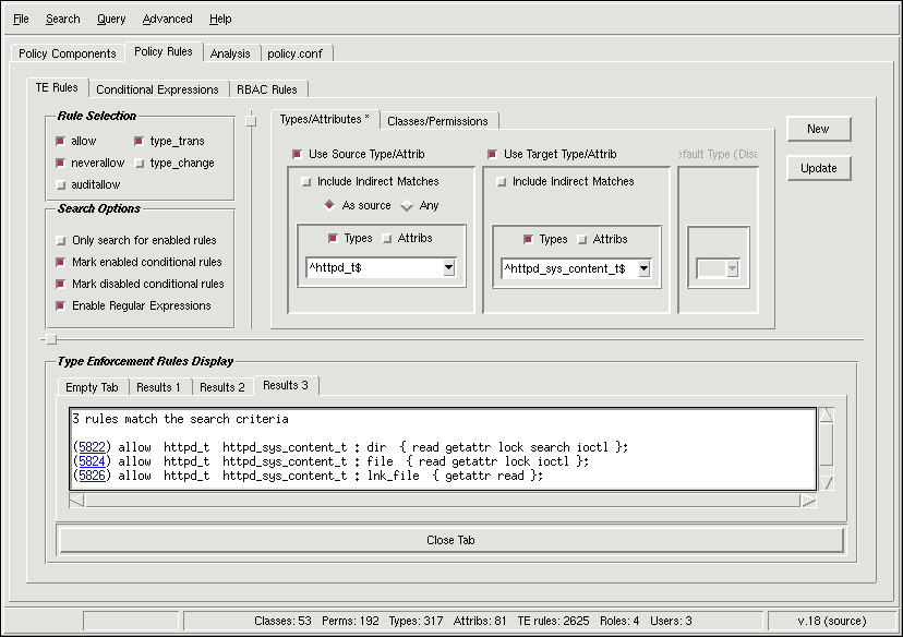 Within the search results, there are hyperlinks to the left of each rule. The number corresponds to the line number in policy.conf, and clicking on, for example, (3813) switches your view to the policy.conf tab, taking you directly to line 3813. These hyperlinks are only visible if you have apol analyzing the policy.conf file.